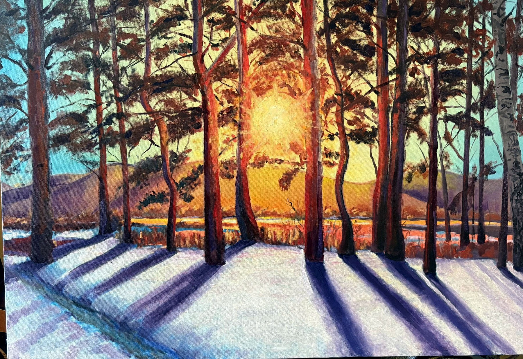 24 X 36 oil on canvas. Golden Hour Glow is more fromn a series I developed to capture winter light on snow. I loved the long red rays bouncing through trees along a cross country ski trail and casing long purple shadows on the sparkling snow.