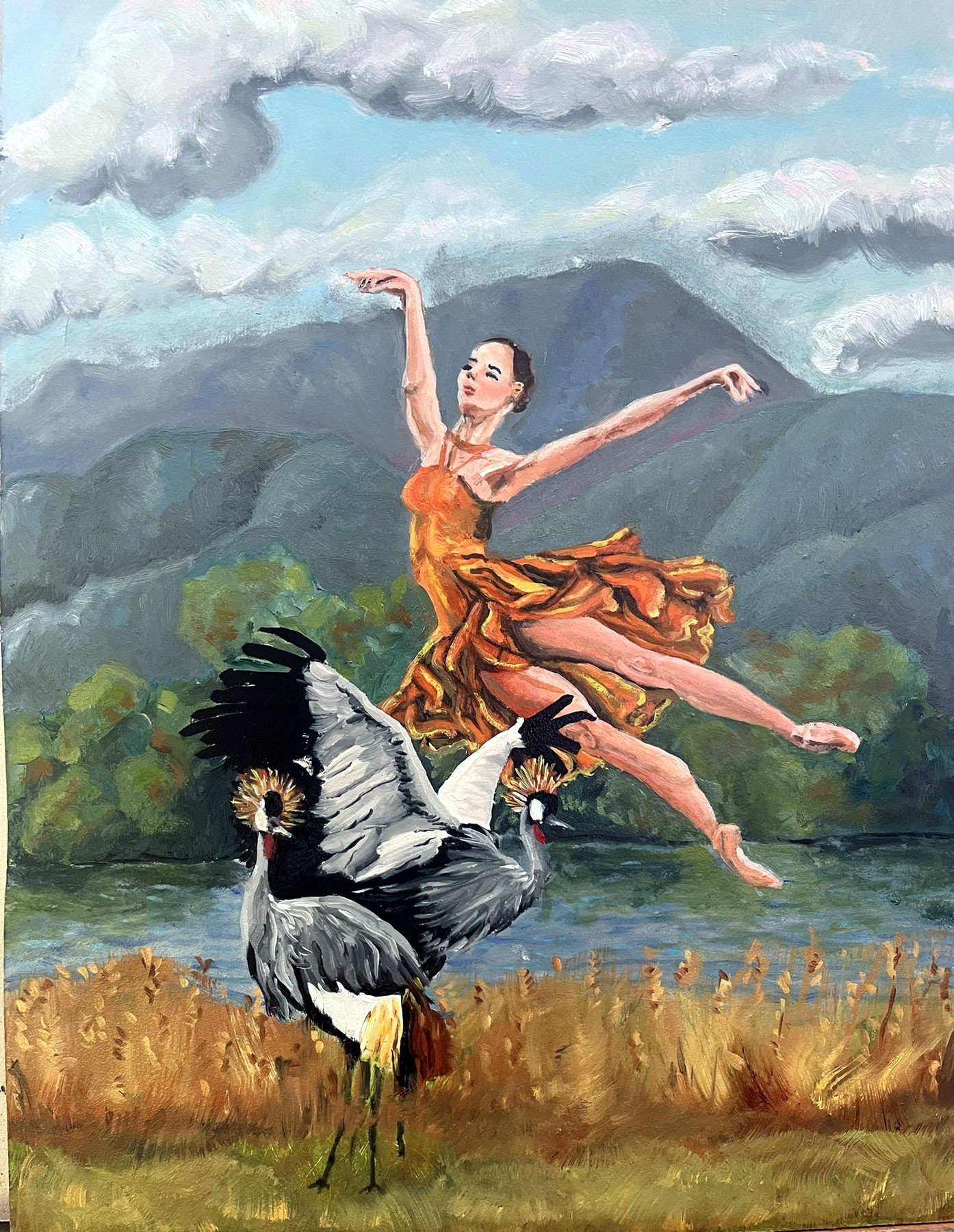 12 X 16 oil on board. This is part of the Birds and Ballerinas Series inspired by the similarities in the joyful dance moves between the species. Crane Ballet, Jump presents a ballerina frozen mid-leap, her orange dress billowing above a lakeshore while two crowned cranes echo her motion at the water’s edge. Warm, energetic tones of the dancer contrast with the cool blues and greens of distant mountains and reflective water, producing a striking visual balance. Expressive brushwork and attention to plumage and fabric detail guide the eye through a rhythmic exchange between human form and nature. Soft clouds and layered ridgelines add a calm sense of depth, making this an elegant, uplifting piece—an ideal choice to bring movement and refined presence to your living room, studio, or office.