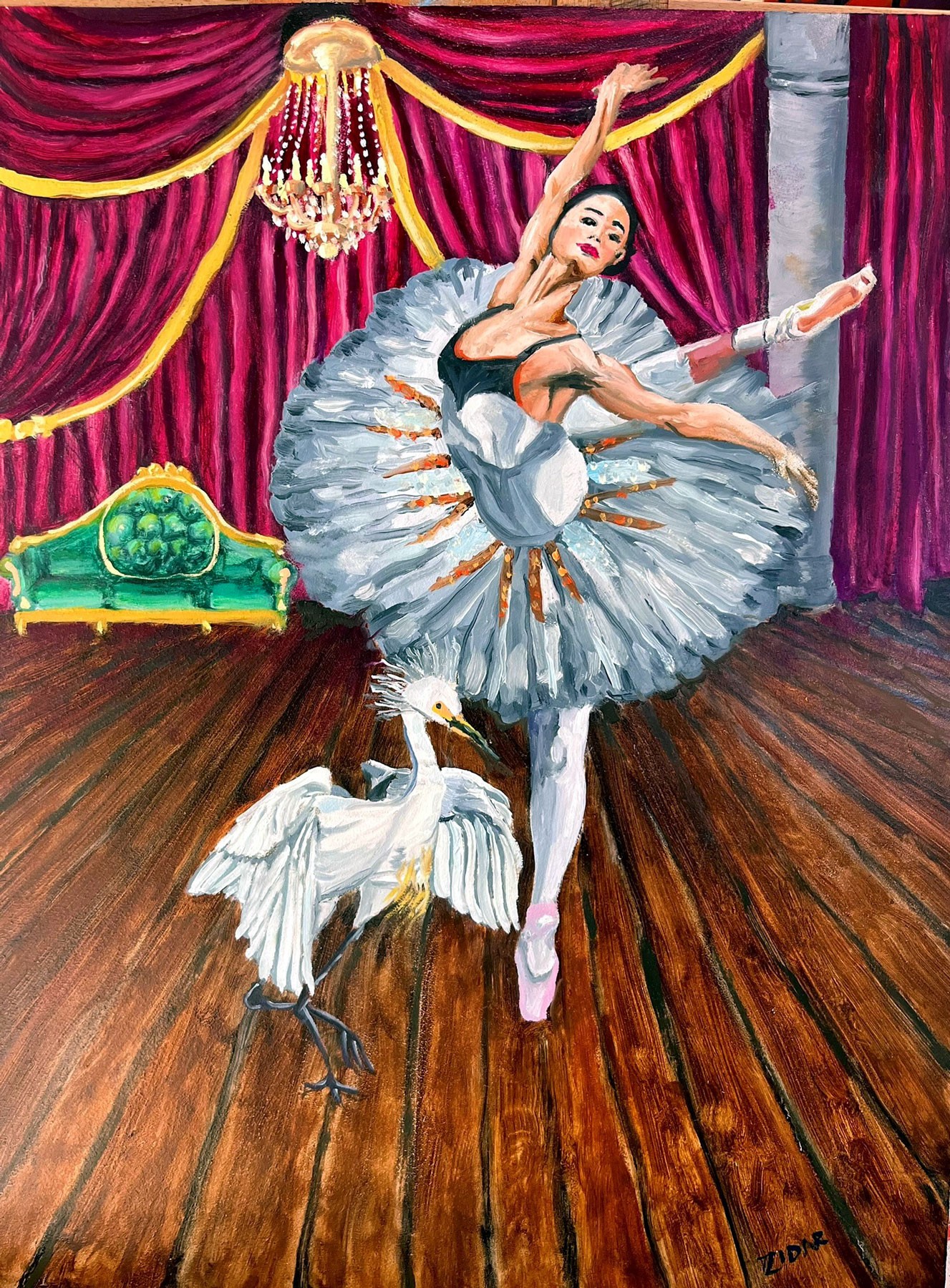 12 X 16 oil on board. This is part of the Birds and Ballerinas Series inspired by the similarities in the joyful dance moves between the species. "On Stage" presents a poised ballerina mid-pose, her tutu fanning out with intricate detail that echoes the graceful form of the white swan beside her. The rich burgundy curtains and polished wooden floor provide a regal setting, while the chandelier and green velvet sofa add touches of sophistication. This artwork conveys a serene yet dynamic interplay between human and nature, offering a refined accent to any space.